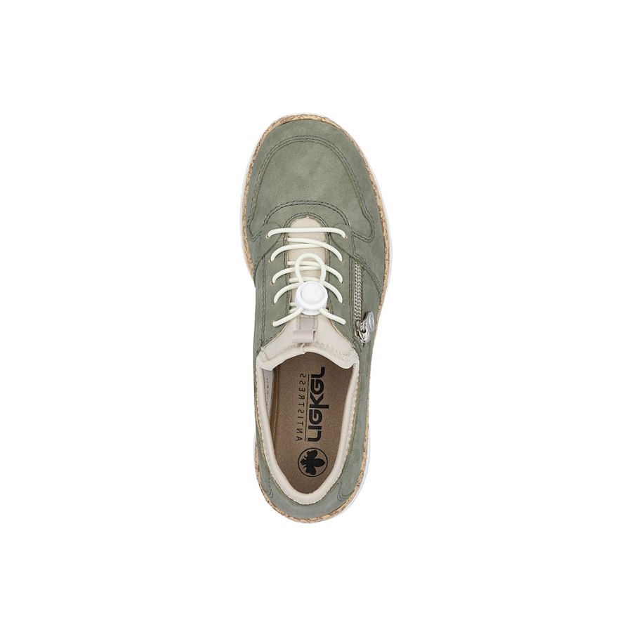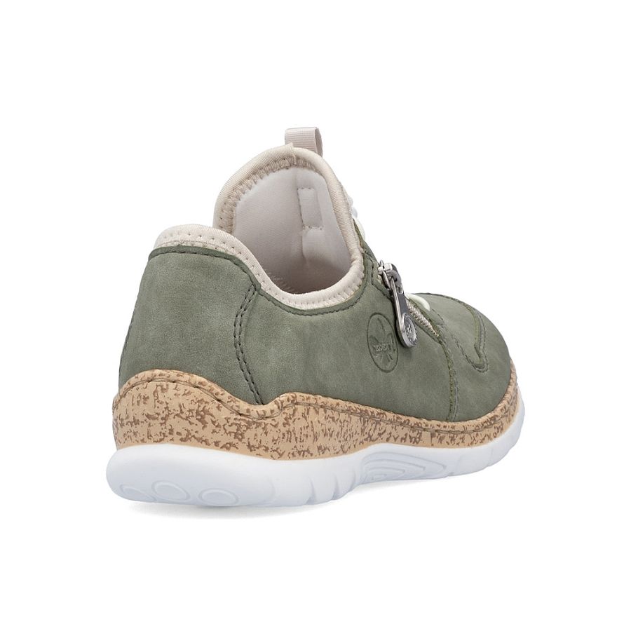 En riktigt mjuk sneakersloafer från Rieker. Med en dragkedja som dekoration på utsidan samt "snabblås" och resår . Skön, mjuk innersula. Ovandel i imiterad nubuck. Passande sneakers att ha till vår och sommar.